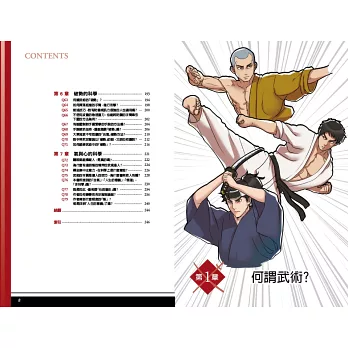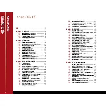 本書第一章先說明武術與一般運動型格鬥技的差異,以及實戰型武術的優勢和需注意的地方;第二章介紹打擊技的科學,在無武器的情況下,如何提升攻擊的威力?運用力學、物理學等,學習如何給與重擊,或是面對對手的強力攻擊,又該如何對招?第三章、第四章介紹日本時代劇中常見的武器,諸如武士刀、薙刀、長槍、弓箭等武器的構造與正確使用的原理,以及遇到短兵相接時該如何應對,這兩章節都有詳細介紹。此外,更特別介紹因李小龍武打電影而風靡全球的雙截棍的使用技巧。第五章從身體運行的步法開始說明,並與步法相關的借力使力的重心轉移方法和原理,使讀者更能正確且無傷害地使用身體力道。另外,更教授透過這種身體巧妙地轉動,製造一種欺瞞對手的移動技巧,而在對手無察覺之間,順利取得勝利。第六章談破勢,這是一種面對體型比自己壯碩的對手時,常會使用的技巧。最後,第七章談氣與心的科學,學武切忌心浮氣躁,其實不只是武術,做任何事也應該學習一流武術大師的氣定神閒,泰山崩於前而色不變,這樣才不至於被對手抓住破綻,也是建立起自己內心的強大,不論遇到什麼困難都能坦然面對,無所畏懼。本書就是一本從外而內的武道鍛鍊書籍。