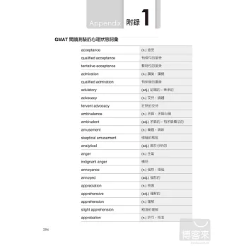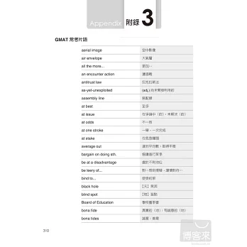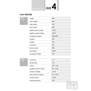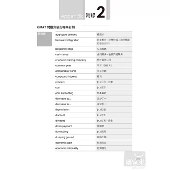 GMAT測驗中,有相當大量的專有名詞。本書在附錄中收錄有關經濟、科技以及數學領域中的常考字彙,幫助考生在閱讀測驗及計量測驗的作答時更能得心應手。