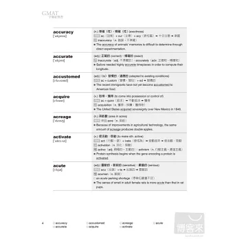 隨著GMAT考題的變化,對於某些字彙,GMAT所側重的字義也有了改變,本書所收錄的字彙及字義,都是近年來GMAT較常出現的,讓考生將時間用在記憶最重要的單字解釋上。