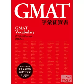 《GMAT字彙紅寶書》在大陸原名為《GMAT詞彙精選》,是北京新東方教育科技集團創辦人俞敏洪,集畢生的教學經驗,傾囊相授之作。書中所收錄的3000個字彙,皆為GMAT考題中出現頻率最高的單字。另外,為幫助考生有效記憶單字,作者自創各種單字記憶法,廣受考生的愛戴與推崇,自出版至今已幫助數十萬名考生取得高分,順利出國留學。