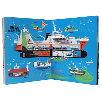以漁船為例,書上有傳統到現代的各式船隻,你還可以打開漁獲加工船,看見魚從去鱗、清洗、切片到急速冷凍的流程。每一頁都有不容錯過的小細節!