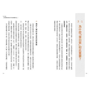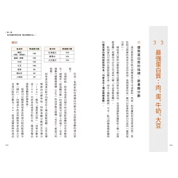 本書歸納多項超過數十年的研究,介紹含有9種「必須胺基酸」的「優良蛋白質」,以圖表清楚呈現最佳的攝取量與方式,欲提升成效,有些優質食物千萬不能錯過。