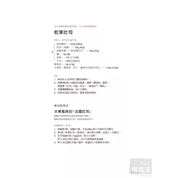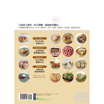 現在,只要透過「麵包機」,放入配料,按下開關,就能做出麵包,如此簡單!每天早晨只要略將麵團整成圓形,輕輕鬆鬆就能做出美味可口的麵包,而且種類豐富、變化多樣,不僅有吐司、麵包、酵母麵包,甚至還可以做長條蛋糕以及麻糬、馬鈴薯丸子呢!只要照著點心食譜中的教學,從此不再耗時耗力,就可享受到天然麵包的風味喔!