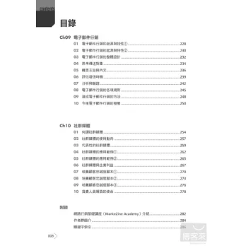 本書是日本網路行銷界熱門講座MarkeZine Academy的課程教材集大成,分為十章,共計100堂課,180張圖表,簡潔快速+仔細詳盡地解說網路廣告、網站優化的基本概念以及架構,讓你同時瞭解理論與實際應用!