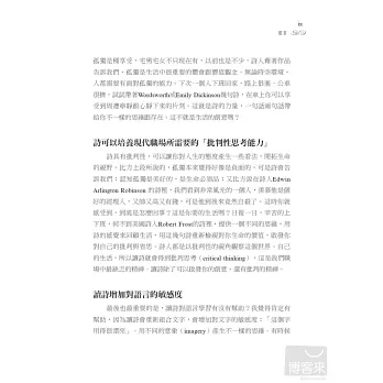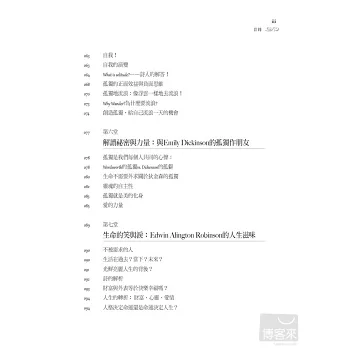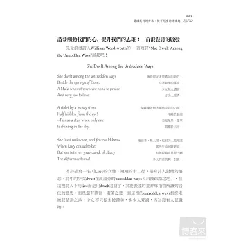 這就是經典的力量,透過詩人淬鍊的一字一句,傳達生命的美好,即使失戀了、迷惘了,細細品嚐也能由苦轉甘,化為肥沃土壤灌溉人生。從丁尼生的詩開始閱讀生活態度;跟著華茲華斯一起去流浪、找回自我;狄金森適切地陪伴我們靜謐的時光、享受孤獨;站在人生的十字路口,佛斯特給我們勇氣,開創嶄新的人生。