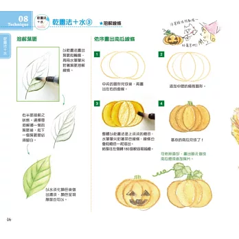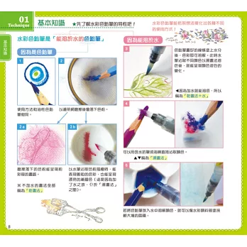 水彩色鉛筆是一種很方便的媒材。乾畫的時候是色鉛筆的質感,但只要加水,就可以如同水彩般暈染。然而,除了基本的乾、濕畫法之外,還有很多種令人意想不到的變化。本書收錄46種簡單又有趣的技法,像是帶有意外驚喜的噴濺與吹畫,灑鹽畫出美麗的夜空,用橡皮擦揉出毛蓬蓬的小鴨,此外就連牙刷、保鮮膜、叉子,都可以使用。請用玩樂的心情,盡情施展色彩吧!