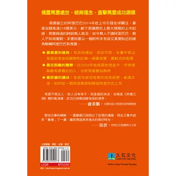 馬雲創立的阿里巴巴於2014年上市引發全球關注,募資金額高達218億美元,創下美國歷史上最大規模的上市(IPO)紀錄,馬雲締造的神話無人能及,如今無人不識阿里巴巴,無人不知淘寶網。本書以一個前所未有卻又真實貼近的視角揭開一個真實的馬雲:「狂妄馬雲」、「幽默馬雲」、「創業馬雲」…… 沒有冗長說教,沒有空洞吹捧,只有冷靜豐富的細節;沒有高深的理論,沒有虛假的傳言,只有通俗、誠懇的陳述,試著解構馬雲這個人,阿里巴巴這家企業。