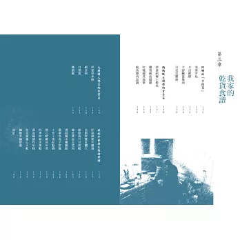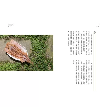 乾貨店往來的客戶群少不了各路菜系的大廚,作者邱明琴的阿嬤、媽媽、大嫂除了一身手藝,也常與飯店大廚交流、學習而鍛鍊出個人的招牌菜。本書末精采收錄利用乾貨烹調的24道好菜與讀者分享。例如,阿嬤的韭菜芋包、媽媽的魷魚螺肉蒜鍋、大嫂的炒米粉、邱明琴的翡翠烏魚子拼盤。從這些美食,讀者彷彿可以聞到邱家「南記行」撲鼻而來的乾貨味道,也依稀能聽到舊市場裡穿梭雜沓的聲音。