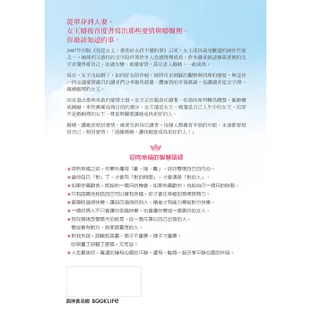 現在,女王也結婚了,如同好友陪伴般,她將用更細膩的觀察與同理的態度,與這些一同走過愛情歲月的讀者們分享她所經歷、體會到的幸福真諦,也讓讀者從文字裡一窺婚姻裡的女王。
