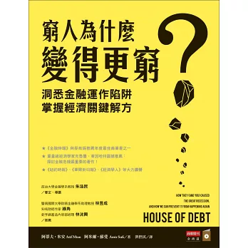 「很多書討論2007~2009年撼動美國經濟的景氣繁榮和接踵而至的破滅,但具洞察力且有事實根據的分析少之又少,本書就是少數奇珍異寶之一。它深入檢視與危機有關的住宅狀態、消費信用、家庭所得及債務,並依據事實探討危機的成因和後果。本書分析的危機化解之道清楚嘹亮,不僅適用於美國,也適用於許多深陷嚴重財政困頓的國家。」――萊因哈特(Carmen Reinhart),哈佛大學經濟學教授,《這次不一樣:800年金融危機史》共同作者