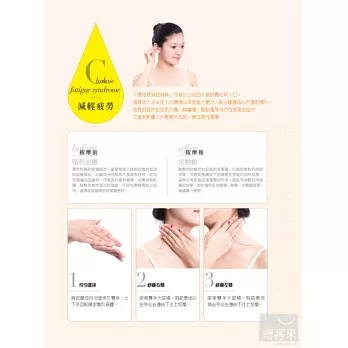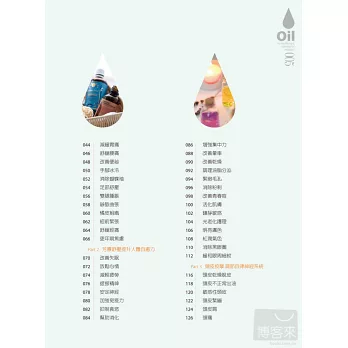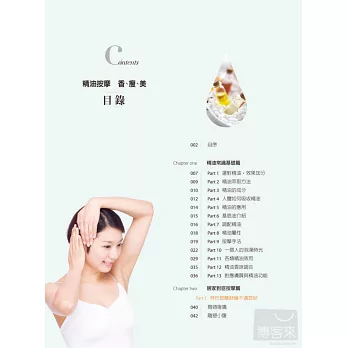 本書還針對您想改善的問題,像是頭痛、肩頸痠痛、失眠、壓力大,或是有橘皮組織、經痛、青春痘等42個症狀,step by step教您如何使用對的精油做正確的按摩,不但能改善身體不適,還兼具瘦身、美容功效。讓作者帶著您進入芳療的領域裡,慢聞自然散發的愉悅芳香,改善你的健康、舒緩你的身、心、靈!