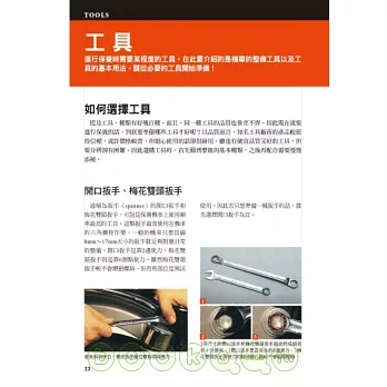 1、內容多元的章節—由初階到進階,從認識摩托車的種類、維修保養的工具、以及提高性能的調教等等,分門別類詳細地解說,內容淺顯易懂。
