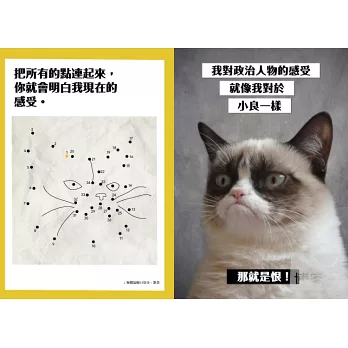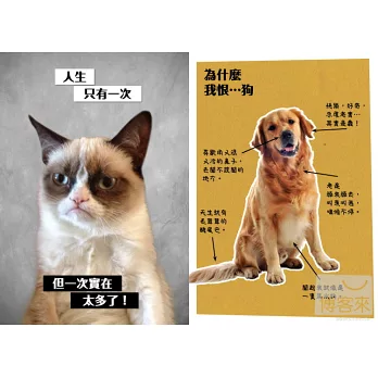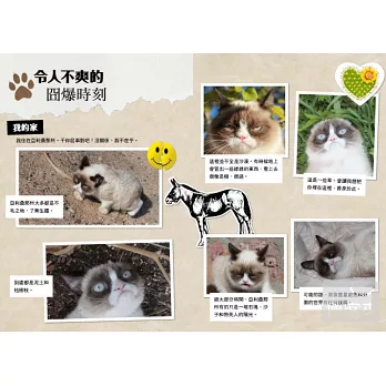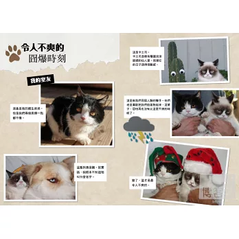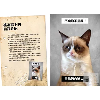 『一個創新的概念,本書收錄許多網路爆紅臭臉貓咪「不爽貓」的照片。光是看著封面副標「令人滿腹牢騷的各種小訣竅與小活動,絕對能夠讓您抒發心中的不爽!」就已經讓人想要趕緊翻開它!這本精巧的彩色書籍,將會讓您不斷在閱讀的過程中放聲大笑!』