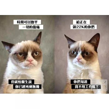 一派不爽樣,對啥事都漠不關心,討厭可愛的貓咪、痛恨口水直流的笨狗,口頭禪只有兩個字:NO!(不要!)與GOOD!(很好!),牠就是...臉臭到(意外地可愛!?),讓你絕對過目不忘的【「不爽貓」(Grumpy Cat)】!
