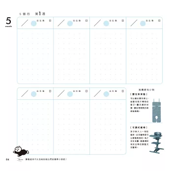 【特色一】從產檢到寶寶出生後一年間的成長點滴,將小寶貝每天成長的記錄寫下來,可幫助找到育嬰訣竅。不只可以寫日記,也能畫上插圖或貼上照片。