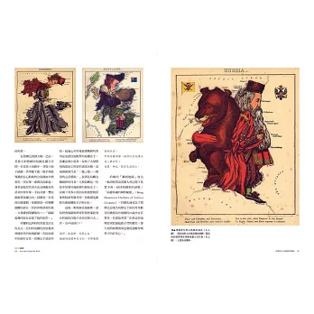 ‧1869年兒童地圖讀物《地理好好玩》,利用各國領土輪廓,以擬人化的方式呈現該國人民特性與生活面貌,法國是有著誇張鷹勾鼻的自戀女王,蘇格蘭是穿著格子裙吹著風笛的小伙子
