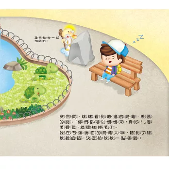 有一天,他在夢寐以求的烏龜島醒來,以為終於可以悠哉的生活,不料,這個烏龜島上的烏龜們,各個手腳俐落、行動敏捷,他仍然是最慢的那一個。為什麼住在這裡的烏龜們會和大家想的這麼不一樣呢?原來,烏龜們的祖先曾經因為速度太慢,而遭受滅村的命運,於是烏龜們鍛鍊自己的速度,在大災難來臨時,才能及時逃命。至於大災難,至今也還沒找到源頭。身為人類的球球,在與烏龜們感情越來越好的同時,卻也漸漸發現,這些災難的源頭,其實來自於人類……