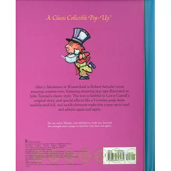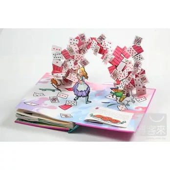 讀者可曾想像過在翻開立體書頁的剎那,看見撲克牌滿天飛舞的奇景嗎?由紙藝大師 Robert Sabuda 所創作的”Alice\’s Adventures in Wonderland”愛麗絲夢遊仙境〈立體書〉,運用了絕佳的紙張裁切設計,鬼斧神工地將愛麗絲的夢境,幻化成超乎想像的童話國度!扉頁之中最令人驚奇的一頁,鐵定是親眼目睹一個「愛麗絲巨人從小屋子裡爆出手腳」的畫面。怪就要怪那瓶神奇水了,愛麗絲才喝到一半,手腳就開始變長,腳伸出煙囪、手竄出門去?..誰知道寫著「吃我呀」的蛋糕,又會把愛麗絲變成什麼?在變大縮小的瞬間,剛剛「巨人愛麗絲」所哭出的「眼淚池」,還可能把「迷你愛麗絲」淹死呢. 平面故事書再也無法滿足現代讀者了!想跟著愛麗絲一同經歷神奇夢境嗎?珍藏這本酷炫立體書,現在正是時候!