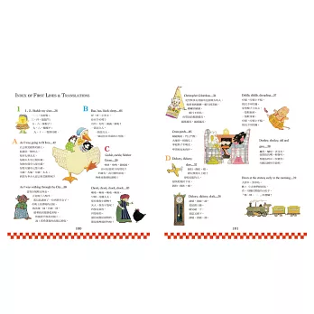 全套包含:1本英中雙語精裝圖畫書(26.7×29.9公分,全書以英文呈現,後附中文對照翻譯) + 1片英文CD(共53首童謠)