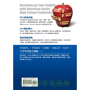 此外,TOEFL、GRE、GMAT、SAT、TOEIC及大學學科能力測驗等考試,多半以美國高中以下英文程度及常識為命題範圍。本書呈現的方式與各種英文能力檢定測驗的閱讀測驗相呼應,適合各級考生作為準備考試的材料。