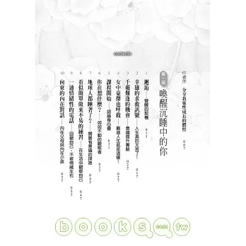 這本書是張德芬誠摯與你分享的禮物。她將自己多年來靈修所得的菁華融入書中,透過本書,你可以跟著書中主角一起練習各種身心靈修習方法,體驗意識提升的喜悅。