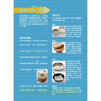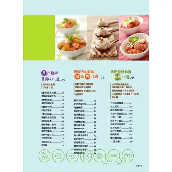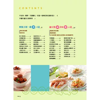 「小小米桶的零油煙廚房:82道美味料理精彩上桌!」除了有詳細的作法、步驟圖外,更貼心的準備了每道菜精準的製作份量、預估準備及料理時間,更依菜式分為:輕鬆方便一碟<蒸>18道、細火慢<滷>美味<燉>20道、<煮>出健康真風味 16道、無煙去油原味<焗&烤> 16道,以及低熱量無負擔<涼拌>12道。您可以依家中人數與喜好挑選,搭配組合成一桌豐富營養的晚餐,享受低油、健康更安心的美味。