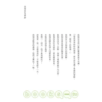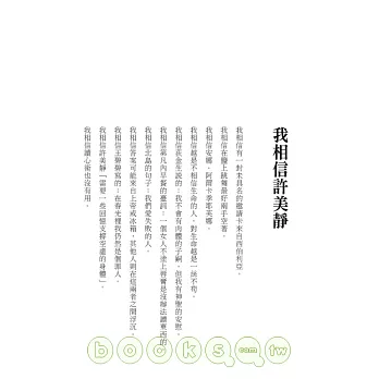 辛波絲卡說:「詩人是天生的懷疑論者。」策蘭說:「世界到處開花;而詩,依舊來自絕望。」似乎詩人多數時候必須是質疑的、失落的、哀悼的、痛楚的——以不信的姿態抵抗這個世界。於是,當與詩集同名的詩作〈我相信許美靜〉裡,詩人不斷以肯定的句式寫下「我相信……」,如同在這個充滿不信與應當不信的世界劃開一道無須服膺任何規範的餘裕,與傷口為伍,讓不可承受之處不再那樣不可忍受。我們得承認苦痛的確會摧毀我們,但我們也可以相信,我們不一定會被苦痛所摧毀。我們並沒有逃避它。