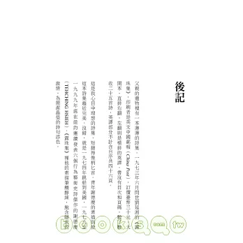 活著便意味著要為生活本身種種瑣碎、無理的勞役進犯、驅策,不論構築多少堅固的防線,總無法避免被擊潰的時刻,懊喪一再襲來,就算每日做體操也不會好轉。當生活裡的困窘與不堪像暴晴的陽光澆淋燒灼雙眼,黑色的詩句成了庇護的餘蔭,在一個個失眠的長夜與氣餒中醒來的清晨,讓人在失溫中能再一次感受到穿透皮膚的些許暖意。人事全非,幸好還有這些詩句的存在。