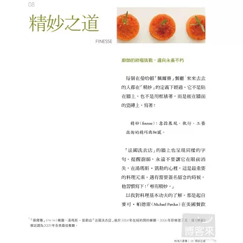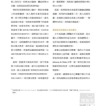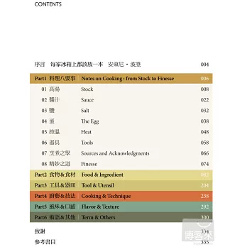 書前另有八篇精闢文章,提供做好菜的法則,如:用鹽要法、了解火候、使用正確工具、用蛋要則、高湯密技、醬汁製作、建議讀物、追求精妙之道,盡是料理人應該知曉並探尋的奧祕,更是廚房操作的重要技巧,本書是受益無窮的料理法寶!