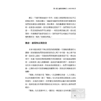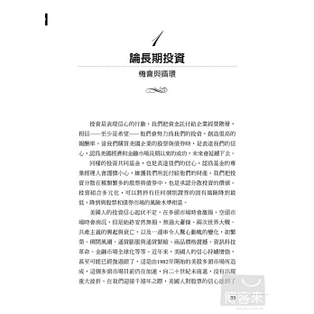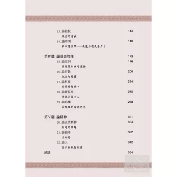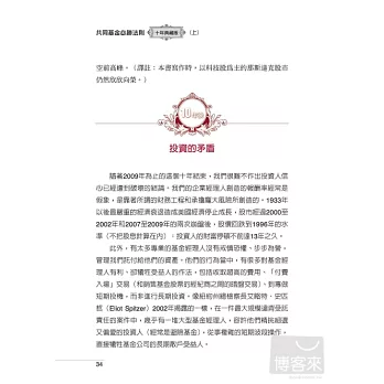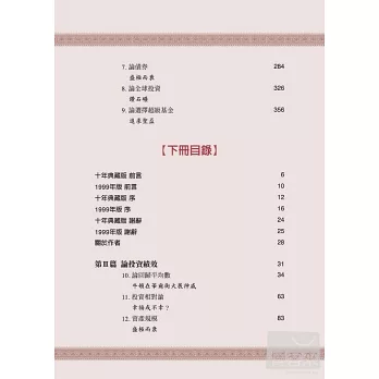 ◆全書共分上下冊五大篇;(上冊):第一篇 論投資策略、第二篇 論投資選擇, (下冊):第三篇 論投資績效、第四篇 論基金管理、第五篇 論精神。
