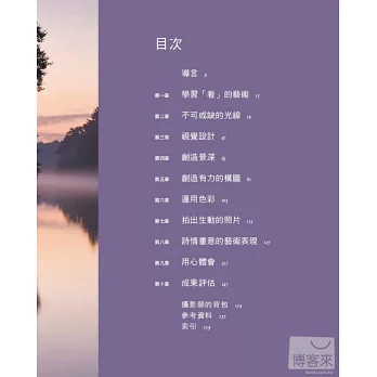 如果你是攝影初學者,這本書將為你打開攝影眼;如果你已有多年的攝影歷練,這本書將精化你的眼界,讓你的個人風格更突出。