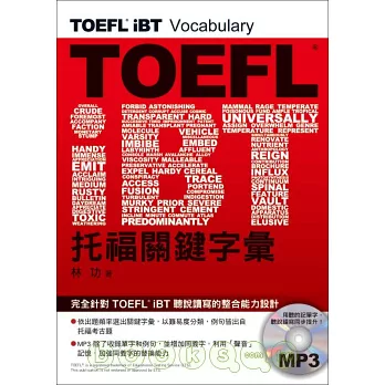 本書是托福大師林功,針對TOEFL? iBT 聽說讀寫的整合能力所編寫。作者自歷屆考古題及出題頻率選出關鍵字彙,以難易度分類。MP3除收錄單字和例句外,並增加同義字。考生藉由反覆的聽、讀,能有效的把生澀單字、同義字及例句「聽」進大腦中。利用「聲音」記憶,聽力、口說、閱讀、寫作,四大能力,同步提升!