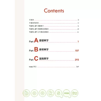TOEFL iBT 聽、說、讀、寫四大考試項目的共同特色,是測驗考生「單字.同義字的替換能力」。因此,除了積極擴充單字量,還必須多看、多聽、多唸、多寫,才能有效提升字彙替換能力!