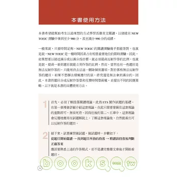 NEW TOEIC考生需在75分鐘內,完成100題的閱讀測驗,平均一題的作答時間只有45秒!考生想在閱讀中拿高分,「時間」就是最大的敵人!如何戰勝時間壓力、提升答題速度?除了多讀文章、多寫題目是必要的練習之外,學會「段落閱讀理論」,是唯一能幫助考生分秒必爭,迅速作答的致勝技巧!
