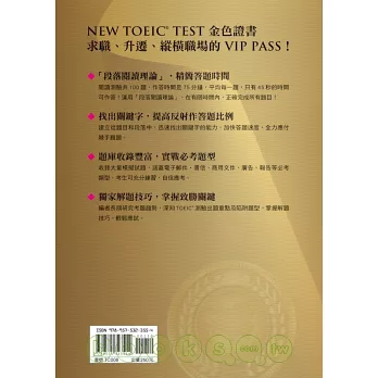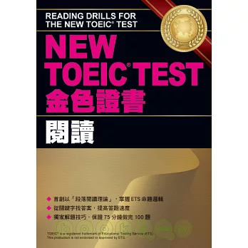 《NEW TOEIC TEST 金色證書──閱讀》是由居於日本領導地位的The Japan Times出版社與眾文圖書公司所合作出版的系列叢書之一,並由日本最著名的留學考試外語學院Institute of Foreign Study教師團隊,經過長期分析TOEIC試題、研究考題趨勢後,所精心編寫的題庫本。