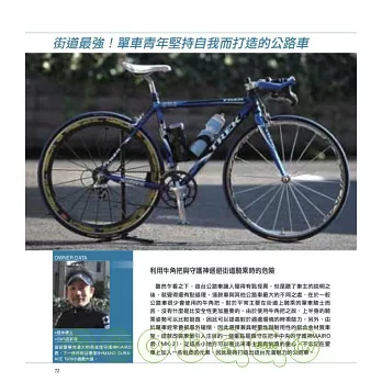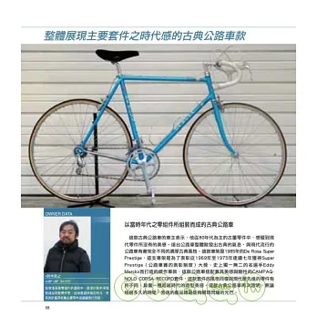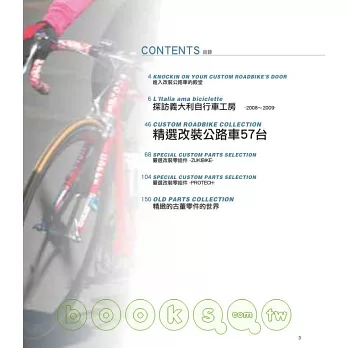 如今任何人都可以很容易買到公路車,有人終於體驗到騎乘公路車的速度快感,也有人著迷於公路車的造型美感吧。最重要的是,許多人們發現到公路車可說是最適合展現自我的道具。世界各地許多不同年齡層的人愛上了公路車,因此他們的愛車理所當然也是各有不同,因此或許我們無法將這麼多樣化的車款全部歸類為所謂的「公路車」類別。本書以下將要介紹的是不問理由,也不問目的的自由世界,由每個公路車愛好者及其愛車所編織而成的故事。那麼就讓我們開始進入改裝公路的殿堂吧。