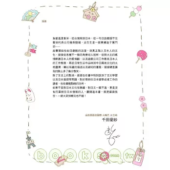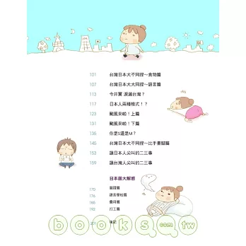 Ps.本書內容所收錄的精采篇章,除了重新編整之外,更特別新繪插畫及照片,讓您更貼近日本生活實況,不用住日本,也能實際感受台灣、日本生活大不同的精采與趣味!