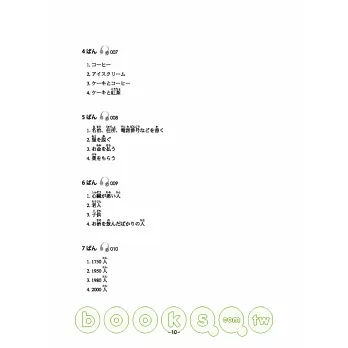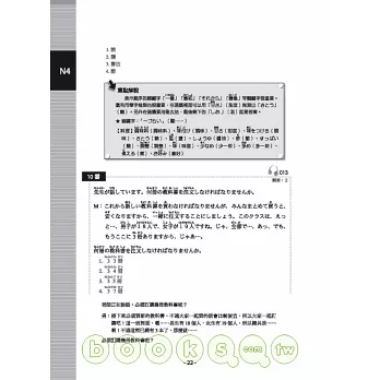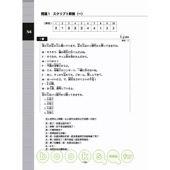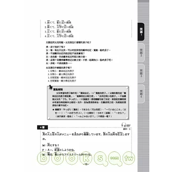 4.收錄完整兩回「聽解」模擬測驗,100%模擬日檢聽解35分鐘考試時間,包括唸題速度、題目長度、對話情境以及試題播放停頓時間長度等,讓你宛如置身考場。