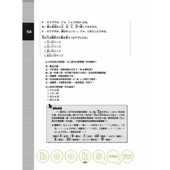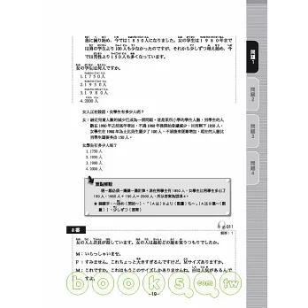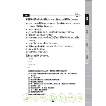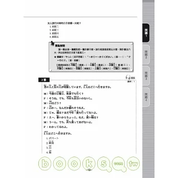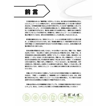 2.不同於坊間同類書籍,將新制考題方向解讀為「語彙」難度增高。事實上,日本官方公佈的新制測驗主旨為「能否實際利用學到的日語做溝通」。換句話說,主考機構希望考生能夠靈活使用文字、語彙、文法、聽解能力,來解決日常生活中各式各樣的課題,而非僅僅應付考試考高分。因此,本書試題緊扣「實用化」的考試精神,收錄各式豐富的情境對話教學,包括:購物、辦公室事務、看病、天氣預報、時事議題、美容瘦身、問路、情侶對話等。是最有效的考前衝刺指南。