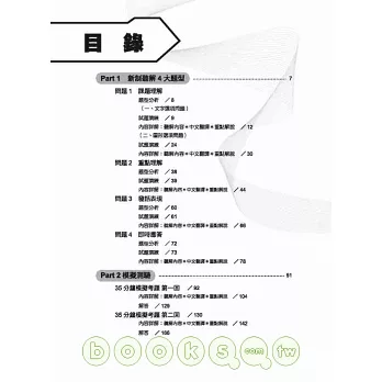 1.不同於坊間綜合模擬試題本僅簡單列出考題和解答,本書深入分析題型,對每一題試題詳加解說,包括「關鍵字」、「重點句」、「使用時機」以及「引申的含意」等。並揪出考生最容易犯錯的答題重點,