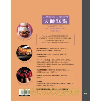 雙面跨頁的20張照片代表Pierre Herme大師的「最愛」,在這些獨創作品中,Herme大師巧妙地運用著口感與味道之間的搭配:柔軟和酥脆、熱和冷、酸與苦…等,包括:散發醉人玫瑰花香的冰杯玫瑰馬卡龍Coupe glacee Ispahan、有著絲滑白巧克力慕斯的激情Emotion Exalte、由百香果甜凍構成的絲滑感受sensation satine…讓饕客們垂涎三尺。《大師糕點DESSERTS》Pierre Herme 大師2009年最新版著作,法國與美國亞馬遜網路書店5顆星推薦,受到無數饕客讀者的歡迎。