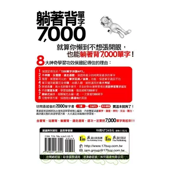 《躺著背單字7,000》由暢銷書作者蔣志榆老師及英語教學名師胡欣蘭專為台灣英語學習者精心編寫,內容豐富涵蓋單字、發音、例句、文法、聽力,最詳盡完整的英語學習方案,大大滿足各階層的學習者。