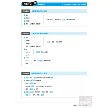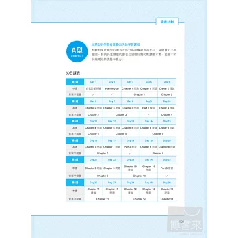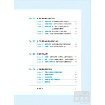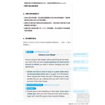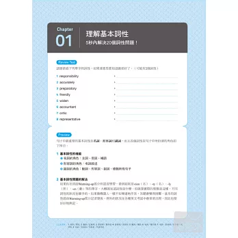 每個章節前除了再次複習前一章所提到的概念和祕訣之外,還有預習該章會學到的觀念和技巧。在進入文章之前先有心理準備,也能驗證和測試自己的英文實力到哪一個階段。