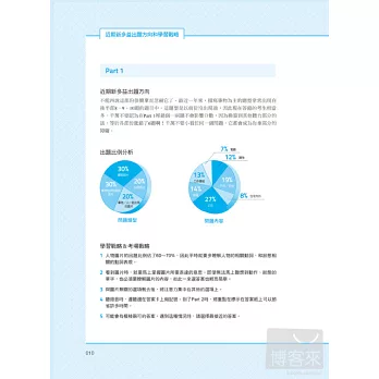 這本書的每個單元以「攻略 → 小考 → 統整 → 沒有答對會後悔的考題(低難易度)→ 考題實戰練習(實際難易度)」的五個學習步驟而構成。