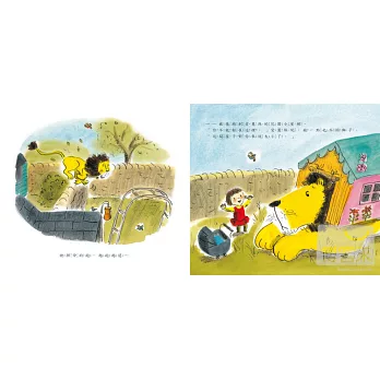 鎮上的人都很怕獅子,他們拿起掃把、擀麵棍…把獅子趕得遠遠的。獅子跑啊跑,跑到小女孩愛麗絲的花園裡。