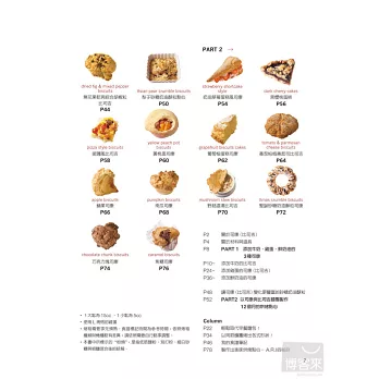.以司康與比司吉麵團,變化12個月甜鹹點心:奶油草莓蛋糕風司康、黑櫻桃蛋糕、披薩風比司吉、番茄帕梅善起司比司吉、野菇濃湯比司吉、蘋果司康、黃桃盅司康…