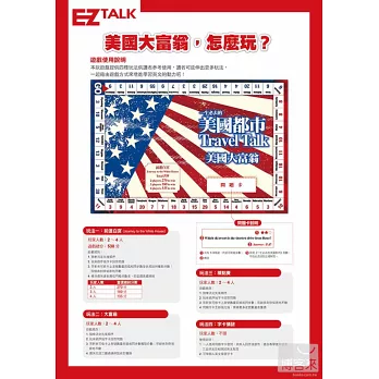● 「大富翁之美國旅遊通」益智遊戲(內含:遊戲圖+72張問題字卡+遊戲說明):回答33個美國都市相關問題,答題累積最多積分,不僅佔領全美國,還能成為真正美國都市通!一款遊戲四種玩法,想和朋友較勁或是測試自己的英文程度都適合!