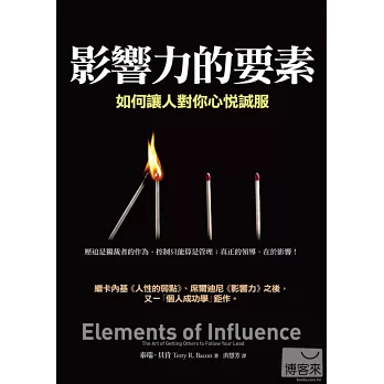 影響力是人生成功的重要關鍵之一。我們無時無刻不在說服他人接受自己的觀點、跟隨自己的指導、加入自己的團體、分享自己的喜悅、購買所推薦的商品和服務……人們就是這樣透過不斷的相互影響以塑造結果。如果能懂得善用影響力的技巧,我們在生活與工作中將無往不利。《影響力的要素——如何讓人對你心悅誠服》要告訴你何謂影響力、影響他人的方式,以及如何發揮有效的影響力。