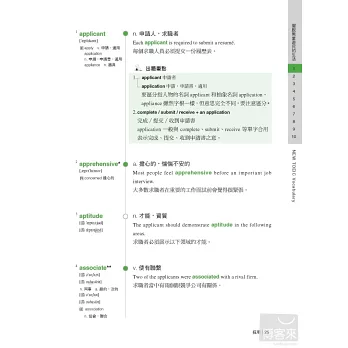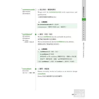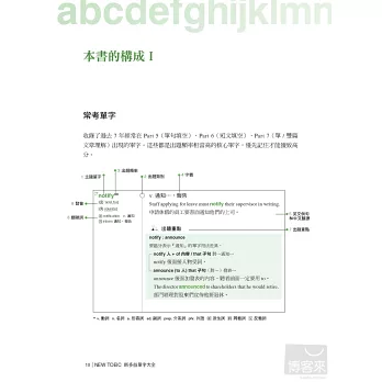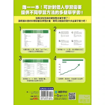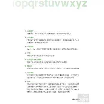 以往很多準備多益的考生,往往一拿到單字書就死命的從第一頁背到最後一頁,這種做法常常把自己累得半死,考試完後卻發現自己的成績並沒有進步多少。其實,我們已經熟到不能再熟的部分,如果還花大半的時間去學習,那只是浪費精力而已,真正最有效率的做法,應該是先了解自己的弱點後,針對自己的弱點來加強,本書不同於以往的單字書,絕對不會讓讀者用這種蠻幹的做法來記單字,讀者可以先翻到p.16頁,做完「診斷測驗」並計算自己的分數後,就可以很清楚的自己單字學習不足的地方,以及未來應該加強的方向。