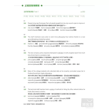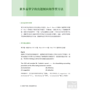 有深度地分析了過去7年的考試題目和最新的新多益題目資料,收錄了出題頻率最高的7200多個單字和用法。包括第5、6部分出題頻率最高的核心單字,第7部分和聽力部分的主要單字。藉由本書可以對新多益單字做最充分的準備。